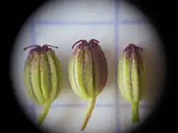 Die Blüten sind weiß, erscheinen aber oft durch purpurfarbene Fruchtknoten leicht rosafarben, vor allem am Rande der Döldchen. Die Kronblätter sind bei einer Länge von etwa 0,6 Millimetern breit-eiförmig und besitzen am oberen Ende ein eingeschlagenes Läppchen.[2] Das Griffelpolster ist stumpf-kegelförmig; die Griffel sind zuletzt etwa so lang wie das Griffelpolster.[2]