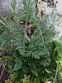 Die grundständig und wechselständig am Stängel angeordneten Laubblätter sind in Blattstiel und -spreite gegliedert. Die Blattstiele der bläulich-grünen Grundblätter sind oberseits rinnig.[3] Die Blattspreiten sind im Umriss meist länglich-eiförmig,[2] zwei- bis dreifach gefiedert mit zusammenneigenden, linealischen Fiederabschnitten. Die Endabschnitte sind meist kürzer als 10 Millimeter und maximal 1 Millimeter breit.[1][4]