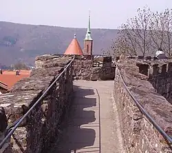 Der früher an der Westwand des Palas stehende achteckige Treppenturm ist aus Sandsteinquadern gemauert und durch leicht auskragende umlaufende Bänder in vier Ebenen unterteilt. Eine rechtsdrehende Sandstein-Wendeltreppe führt mit 95 Stufen an den heute gesicherten Türöffnungen vorbei, die früher zu den verschiedenen Etagen des Palas führten, bis hinauf zur ca. 18 m hoch liegenden Aussichtsplattform. In etwa 13,5 m Höhe befindet sich ein Ausgang zu einer Brücke, die den Turm mit der Mantelmauer verbindet, einer bis zu 16 m hohen Ringmauer, von der aus man einen Rundblick über den Ort und das Neckartal hat. Die Ringmauer umschloss ursprünglich die ganze Hauptburg, ist aber nach Osten und Süden zum größten Teil zerstört.