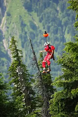 - Die behelfsmäßige Bergrettung wird im Rahmen der Selbst- und Kameradenhilfe von den Begleitern der verunfallten Person und/oder weiteren zufällig anwesenden Personen unter Verwendung der mitgeführten Ausrüstung geleistet. Beispielhaft seien hier die behelfsmäßig hergestellte Seiltrage und der Seilsitz genannt. In manchen Gegenden sind auch Selbsthilfeboxen aufgestellt, die Tragen und Erste-Hilfe-Material enthalten.