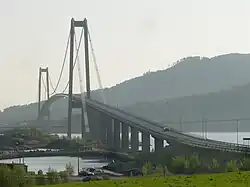 - Die Gjemnessundbrücke in Richtung Südwesten führt zum Festland und bleibt in der Gemeinde Gjemnes. Sie war mit 1257 Metern bei ihrer Erbauung die längste Hängebrücke Norwegens und gehört zu den 100 längsten Hängebrücken der Welt.