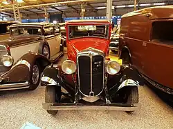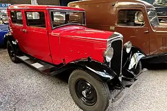 Berliet 11CV Dauphine: Der Typ kam ab 1934 neu hinzu und lief werksintern jetzt unter der Bezeichnung VIRS-11. Der wassergekühlte Vierzylindermotor des Typs MKM (Kopfventile) 80 mm Bohrung und 99,6 mm Hub (Hubraum 2003 cm³) (bisweilen auch fälschlich mit 80×100 mm angegeben)[A 1] hatte 11 Steuer-CV und 50 effektive PS bei 4000/min. Der Radstand betrug 3,06 m. Der Wagen war mit einer Schneckenlenkung ausgestattet. Die Vorderradaufhängung war jetzt mit unabhängigen Rädern an einer Querblattfeder. Die Spur maß 1,35 m. Die Höchstgeschwindigkeit wird mit 110 km/h angegeben.[8] Das Fahrzeug war in folgenden Varianten lieferbar: