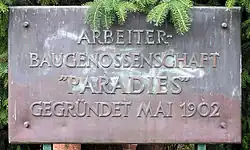 - Gedenktafel für die Arbeiterbaugenossenschaft „Paradies“ an der Straßenecke Paradies-/Buntzelstraße