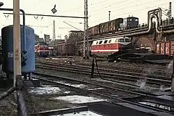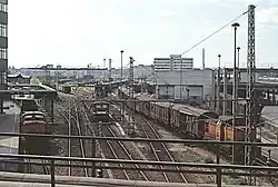 Fernzuggleise Richtung Osten mit Fahrleitungsbeginn, rechts die Halle des tieferliegenden Bahnbetriebswerks, 1991