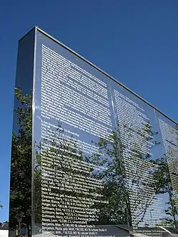 Internationale Beachtung fand Anfang der 1990er Jahre die Auseinandersetzung im Bezirk über die Errichtung des Mahnmals Spiegelwand auf dem Hermann-Ehlers-Platz. Sie sollte an die Steglitzer Synagoge der jüdischen Gemeinde an der Düppelstraße und den Holocaust in Berlin erinnern. Nach einem Wettbewerb gewann 1992 der Entwurf der Künstler Wolfgang Göschel und Joachim von Rosenberg (historische Beratung Hans-Norbert Burkert) mit einer hochglanzpolierten Chromstahlwand.[14] Auf ihr wurden 1723 Namen und Anschriften aus Steglitz deportierter jüdischer Bürger eingraviert, deren Daten den Deportationslisten entnommen wurden. Zwischen den Personenlisten befinden sich je drei Text- oder Bildtafeln zu jüdischem Leben in Vergangenheit und Gegenwart.[15]