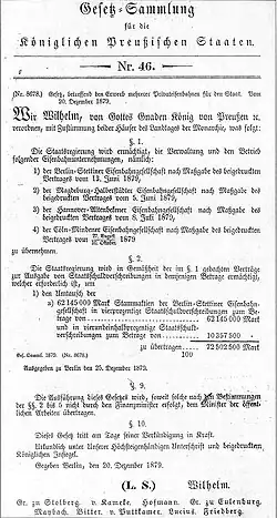 Gesetz, betreffend den Erwerb mehrerer Privateisenbahnen für den Staat, 1879
