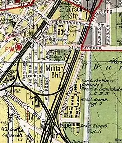 Als Standort war das militärfiskalische Gelände südlich von Berlin bei Schöneberg ausgewählt worden.[3] In diesem Bereich gab es bereits einige militärische Anlagen und genügend Platz für die für das Eisenbahnbataillon nötigen Kasernen- und Versorgungsbauten. Die Arbeiten zum Bau des Bahnhofs Berlin begannen 1874.[4] Der Bahnhof entstand auf dem östlichen Teil des Geländes des Eisenbahnbataillons, westlich davon (an der heutigen Naumannstraße) lag der Übungsplatz des Bataillons.[5] Die Kasernen für das Eisenbahnbataillon entstanden zunächst im Bereich der Kesselsdorfer Straße zwischen Kolonnen- und Monumentenstraße, Neubauten wurden in den 1890er Jahren jenseits der Anhalter und Dresdener Bahn an der General-Pape-Straße gebaut.[5]