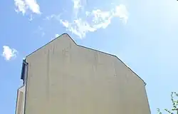 Blick vom Hof auf das Berliner Dach des Vorderhauses mit einer höher geführten vorderen Dachschräge, die einen First ausbildet -