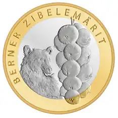 Der Schriftzug «Berner Zibelemärit» ziert zusammen mit Bär und Zwiebelzopf die 10-Fr.-Gedenkmünze 2011.