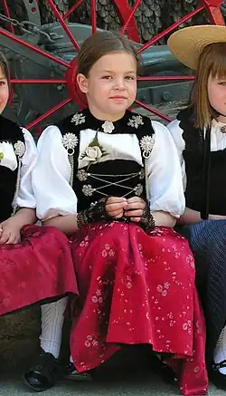 - die Tschöplitracht (Tschöpli = Jacke), Damastseidenschurz in der Grundfarbe Schwarz ggf. mit Blumenmuster, oft blau oder rot. Das Mieder hat lange Ärmel aus demselben Stoff wie der Schurz oder wahlweise nur aus schwarzer Damastseide. Für ganz besonders feierliche Anlässe z. B. als Braut oder Gotte in der Kirche.