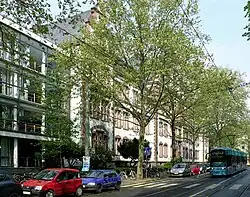 Der Straßenverlauf entlang der Außenmauer des Zoo-Areals knickt nach dem ehemaligen Dienstgebäude des Schuldirektors und des Pedells rasch nach Südosten ab und führt dann geradlinig bis zum Straßenende. Auf der rechten Straßenseite dehnt sich der langgestreckte Komplex des Schulhauptgebäudes mit dem historischen Haupteingang, das durch einen Erweiterungsbau mit dem heutigen Haupteingang noch verlängert wird. An der Gebäudefassade des Erweiterungsgebäudes der Schule befindet sich eine Bronze-Gedenktafel für die früher hier ansässige Samson-Raphael-Hirsch-Schule, eine weitere in der ersten Etage des Lichthofes.[19] Nach einem Parkplatz der Schule folgt der moderne Gebäudekomplex des Kinderzentrums, eine städtische Kindertagesstätte.