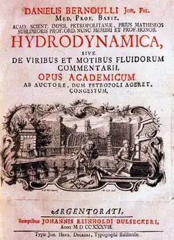 Daniel Bernoulli veröffentlichte 1738 seine Hydrodynamica,[14] siehe Bilder, wo er in Sectio 12 die Ergebnisse von Torricelli und Huygens an einem kleinen Fluidelement (abcd in seiner Fig. 72) kombinierte.[15] So gelang es ihm, den Druck von fließenden Fluiden auf Wände zu bestimmen und die Rolle des Verlusts an kinetischer Energie, die er vis viva nannte, bei plötzlichen Änderungen des Strömungsquerschnitts aufzudecken. Die instationäre Form der Bernoulli-Gleichung erschien 1742 in einem Werk des Vaters Johann I Bernoulli, der es dort auf 1732 vordatierte.[2]:158,166[16]