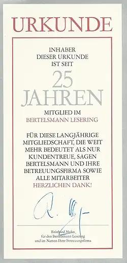 Urkunde mit Originalunterschrift des Vorstandsvorsitzenden Reinhard Mohn