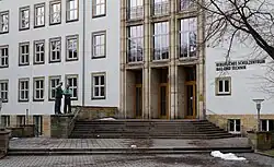 Das viergeschossige Schulgebäude (heute Haus I) wurde von 1952 bis 1953 nach Entwürfen des Architekten Gottfried Kintzer mit einer „Sandstein-Putzfassade“ errichtet.[2] Die „künstlerische Absicht“ des Architekten ist an der „Spannung“ zu erkennen, die zwischen den großen Treppenhausfenstern im Eingangsbereich, der großen Wandfläche mit der Uhr und den Klassenzimmernfenstern mit ihrer gleichmäßigen Anordnung entsteht.[3] Der Eingang wurde mit einer Freitreppe und einer Plastik von Wilhelm Landgraf versehen. Unter dem Dachgesims des Gebäudes befinden sich umlaufend ein als Sgraffito ausgeführtes Schriftband:
