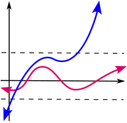 - Es existiert dann eine reelle Zahl , so dass für alle gilt. Anschaulich ist dann die Bildmenge der Funktion im reellwertigen Fall in einem endlichen Intervall oder im komplexwertigen Fall in einem in der komplexen Ebene liegenden Kreis enthalten.