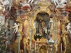 „Der Altar, dessen Gestalt die reine Form des heiligen Tisches nie allzu weit verlassen sollte, wurde zu einem pomphaften Aufbau mit Geglitzer, Lämpchen und Engelchen. Die Handlung umgab sich mit Zeremonien, welche die Phantasie berühren sollten, die Kleidung der Messdiener ging oftmals ins Zierliche und Puppenhafte. Texte und Melodien der Lieder beschreibt er mit dem Wort süßlich. An der Stelle des Messbuches mit großartigen Texten drängten sich selbstgestrickte Messandachten und Litaneien voll künstlicher Vorstellungen und schwächlich unwahrer Empfindungen.“[5] Das Gedächtnis des Herrn wurde eine erbauliche Schaustellung. Das unverständliche Kirchenlatein tat ein Übriges.