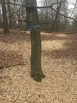 Ersatzmarkierung eines Grabes nach Windwurf im Bestattungswald Glücksburg