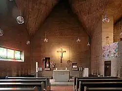 Der zeltförmige Kirchenbau wurde aus grobkörnigem Sichtbeton gefertigt. Der Kirchturm wirkt untersetzt und ragt nur wenig über das kristallin gebrochene Kirchendach und die übrige Bebauung hinaus. Der nahezu symmetrische Innenraum wird durch graue, winklig aneinander anschließende Betonflächen bestimmt. Die Betonflächen der Wände und der Decke unterscheiden sich durch die Körnigkeit des Betons und der Verschalungstechnik. Die starkfarbigen Fenster mit gegenständlichen Motiven wurden nach Entwürfen von Böhm angefertigt.