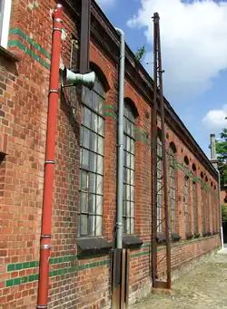 - Wandteil 1 (rechts) ist bauzeitlichen Ursprunges und grundsätzlich ohne Eingriffe. Dieser Wandteil besteht aus zehnachsigem rotbraunem Klinkerverblendmauerwerk im Binderverband sowie grün glasierten Klinkerstreifen in Brüstungs- und Stichbogenanschnittshöhe der Fenster. Aus Steinen mit der gleichen grünen Farbglasur wie die Klinkerstreifen wurde hier die Gesimsabdeckung realisiert. Über den grünen Klinkerstreifen befinden sich auch die Rollschichten an den Fensterbänken. Die Stichbogenfenster dieses Wandteils bestehen aus Stahl mit Einfachverglasung. Jedes Fenster hat ein Oberlicht zum Öffnen und ein Öffnungselement in der darunterliegenden Festverglasung. Die Verglasung der Öffnungselemente besteht hier teilweise aus Drahtglas.