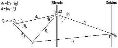 Die Amplitude von ist proportional zur Quellen-Amplitude und zur Blendenfunktion . Die Blendenfunktion gibt die Durchlässigkeit der Blende an. Im einfachsten Fall ist , wenn die Blende geöffnet ist, und , wenn die Blende geschlossen ist. ist das infinitesimale Flächenelement der Blendenöffnung am Punkt :