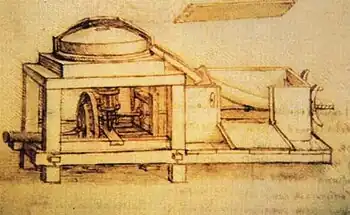Die erste Ab­bil­dung ei­nes Beu­tel­gangs (rechts) skiz­zier­te Leo­nar­do da Vinci um 1498. Er schließt an den Mahl­gang mit Un­ter­an­trieb an (links).[1]