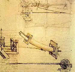Die Details der Zeich­nung von Leo­nar­do da Vinci (Bild­mitte) ent­spre­chen weit­geh­end dem Ga­bel­zeug – am Mühl­ei­sen ein Rä­de­ge­trie­be mit Holz­pflö­cken. Nur die Ga­bel er­setzt ein dün­ner Stock.[1]
