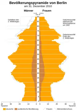Die am häufigsten in Berlin vertretenen Jahrgänge waren im Jahr 2020 sowohl bei den Frauen als auch bei den Männern die Jahrgänge 1985, 1986, 1987, 1988, 1989, 1990 und 1991.[3]