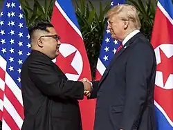 Danach kam es überraschend zur Annäherung der beiden Staaten und zu einem Gipfeltreffen in Singapur zwischen Donald Trump und Kim Jong-Un im Juni 2018. Der Gipfel gilt als historisch bedeutend, weil es die erste Begegnung zwischen einem US-Präsidenten und einem nordkoreanischen Staatsführer seit der Gründung Nordkoreas 1948 war.[16] Im Februar 2019 kam es zu einem weiteren Gipfeltreffen in Hanoi zwischen beiden Staatschefs. Trump äußerte sich nach den persönlichen Treffen positiv über Kim und bekundete seine „Liebe“ zum nordkoreanischen Diktator.[17] Im selben Monat, vor oder nach dem Treffen, fand eine Geheimoperation der Navy Seals in Nordkorea statt.[18]