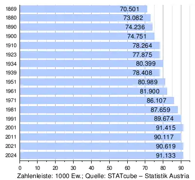 - ↑ Statistik Austria – Bevölkerung zu Jahresbeginn nach administrativen Gebietseinheiten (Bundesländer, NUTS-Regionen, Bezirke, Gemeinden) seit 2002 (ODS)