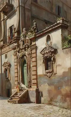 Junge mit Hund auf einer Treppe in Rom, Gemälde von N.F. Schiøttz-Jensen, 1868