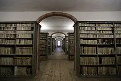 Für die dauerhafte Unterbringung dieser Büchersammlung ließ Francke von 1726 bis 1728 ein Bibliotheksgebäude in massiver Steinbauweise errichten. Dieses gilt heute als ältester noch erhaltener Bibliothekszweckbau in Deutschland. Der barocke, original erhaltene Bibliothekssaal wird als Kulissenbibliothek bezeichnet, weil die Regale wie die Kulissen in einem barocken Theater in den Raum hineingestellt wurden. Diese Aufstellung war im deutschsprachigen Raum neuartig und orientierte sich wahrscheinlich an englischen College-Bibliotheken und wurde vorbildhaft für das Büchermagazin der Moderne.[2] Heute sind etwa 27.000 alte Drucke in vielen Sprachen in der Kulissenbibliothek untergebracht. In weiteren Magazinen finden sich ebenfalls wertvolle Drucke aus allen Wissensgebieten der Frühen Neuzeit und umfassen auch mehrere hundert Inkunabeln.