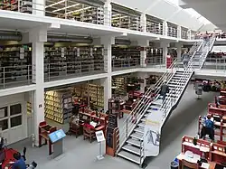 Erschlossen wird das Gebäude über ein Vestibül mit vierläufiger, mittig und frei platzierter Treppe. Um das Treppenhaus sind im ersten Obergeschoss Büros angeordnet. Im Erd- und im Tiefgeschoss befindet sich der Hörsaal. Die drei darüber liegenden Geschosse dienen der Bibliothek. Das Mittelschiff umfasst die Gesamthöhe dieser drei Stockwerke. Hier sind die Leseplätze untergebracht. Die Seitenschiffe dienen als Büchermagazin.[6]