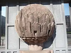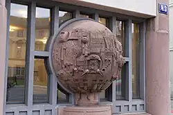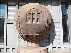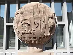 Auffälligstes Merkmal der Außengestaltung sind die „Kugelbäume“, große, aufgeständerte Kugeln aus rot eingefärbtem Beton, die sie wie aus Buntsandstein wirken lassen. Sie stehen im Erdgeschoss entlang der Längsseiten des Gebäudes, jeweils eine zwischen zwei Pfeilern: 10 entlang der Straßenfront sowie eine weitere auf der gegenüberliegenden Seite, weil das Gebäude dort überwiegend an Bebauung grenzt. Die Kugeln sind skulptural gestaltet und symbolisieren die Siedlungsgeschichte der Menschheit.[5] Gottfried Böhm schuf 10 Halbkugeln. Zwei Halbkugeln mit je gleichem Motiv sind zu einem Baum zusammengesetzt. Inhalt sind architektonische Motive.[4]