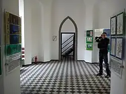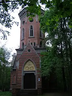 Das Gebäude wurde im neugotischen Stil aus rotem Backstein errichtet. Er verfügt über einen kreuzförmigen Grundriss (13,5 m × 10,5 m). Zentrales Element ist der Turm, der an seiner Basis in der Form eines Quaders mit quadratischem Grundriss, und oberhalb einer Höhe von 10 Metern achteckig ausgeführt ist. Über dem Haupteingang befindet sich ein Wappen des Erbauers. Auf der Turmspitze befindet sich in 22 Metern Höhe eine Dach- und Aussichtsterrasse.[1]