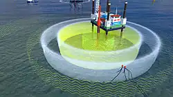 Ein flexibles Schlauchsystem, das mit speziellen Düsenöffnungen versehen ist, wird in ausreichendem Abstand um den Ort der Schallerzeugung auf dem Meeresgrund verlegt. Je nach Beschaffenheit von Meeresgrund und Wasserströmung können bis zu zwei Ringe eingesetzt werden. Ein mit speziellen Kompressoren ausgerüstetes Schiff presst während der Schallerzeugung mit bis zu 10 bar Luft in das Schlauchsystem. Die Druckluft entweicht durch die vorgesehenen Düsen. Die stetig aufsteigenden Luftblasen verändern die physikalische Beschaffenheit des Wassers. Schallwellen werden mehrfach gebrochen und die Lautstärke wird gemindert.