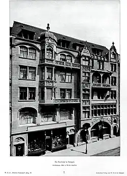 - 1897: Wohn- und Geschäftshaus mit Restaurant/Café „Reichshof“ in Stuttgart-Mitte, Tübinger Straße 17A und 17B[11]
