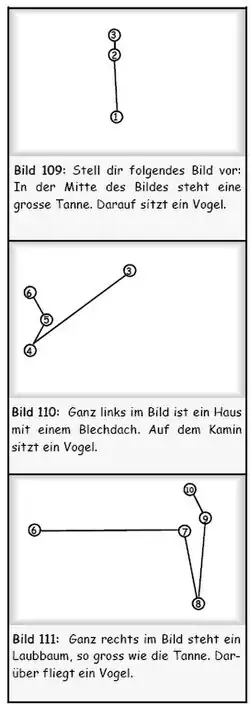 Die nebenstehende Bildfolge zeigt die Blickbewegungen auf eine leere Leinwand, die erfolgten, wenn der Proband aufgefordert wurde, sich entsprechend dem jeweiligen Text etwas vorzustellen.[Anmerkung 1][4]