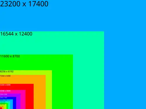 | 400 MP | 23200 × 17400 | 4:3 | 403.680.000 | 392 × 294 | 196 × 147 | 98 × 74 |