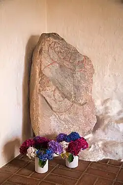 Der Stein zeigt nur eine grobe Ritzung. Abgebildet ist Thors Fischzug – mit dem Detail, dass Thor den Boden des Bootes durchgetreten hat.