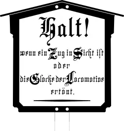 Bei vielen Eisenbahngesellschaften war bis kurz vor Ende des 19. Jahrhunderts die Praxis üblich, vor Eisenbahnübergängen an den Wegrändern zu je beiden Seiten zwei Schilder aufzustellen: eine Halt- und eine Warnungstafel. Die kleineren Halt- oder Merkpfähle sollte 12 bis 15 Meter vom Übergang entfernt aufgestellt werden, die Warnungstafel mit dem ausführlichen polizeilichen Gesetzestext über das Verhalten an den Übergängen war nahe der Schienen zu montieren. Vorgeschrieben war, dass bei geschlossener Barrière Fuhrwerke und Viehherden an der Halt-Tafel zu warten hatten. Die Halt-Tafeln bestanden ursprünglich aus Holz und waren mit weißer Ölfarbe gestrichen und mit schwarzer Farbe beschrieben. Die Aufschriften der größeren Warnungstafeln waren dagegen auf weiße Leinwand oder Kanevas aufgedruckt und auf Holz genagelt. Zur Sicherung gegen die Witterung war die Warnungstafel bedacht. Gegen 1870 gingen die Eisenbahngesellschaften dazu über, die Tafeln aus Eisen anzufertigen, da die Holztafeln relativ schnell verwitterten.[10] Seit Ende 1894 wurden an allen königlich preußischen Strecken der Staatseisenbahn die Halt- und Warnungstafeln abgeschafft und gegen nur noch zwei Warnungstafeln – je eine auf jeder Seite der Bahnstrecke – ersetzt. Diese enthielten zwei normierte, unterschiedliche Texte und waren je nach Textinhalt an Wegübergängen mit und ohne Schranken anzubringen. Zu diesen zwei Tafeln kam noch eine dritte, seltener genutzte Tafel mit ebenfalls abweichendem Text dazu.[11] Ab 1897 galten die preußischen Vorgaben auch für die Großherzoglich Hessischen Staatseisenbahnen, die damals mit Preußen zur Preußisch-Hessischen Eisenbahngemeinschaft verschmolzen.