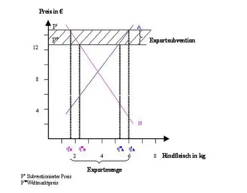 Die Herstellungskosten von Rindfleisch liegen angenommen bei 3,56 €/kg, der Verkaufspreis auf dem Binnenmarkt liege bei 2,62 €/kg und auf dem Weltmarkt bei 2,05 €. Dieses Nahrungsmittel wird also subventioniert, um den Landwirten im Inland garantierte Preise zu bieten und ein ausreichendes Einkommen zu ermöglichen. Durch die starke Subventionierung in den Industrieländern führt dies zur Überschussproduktion von Rindfleisch und deren Export zu Preisen, die unter dem Weltmarktpreis liegen (Abb. 3). Der Rindfleischpreis wird von auf durch die Subvention angehoben, so dass die Produzenten begünstigt werden. Die Konsumenten dagegen müssen im Inland einen höheren Preis für Rindfleisch zahlen. Die Subvention erhöht die Staatsausgaben, die zu Wohlfahrtsverlusten im Inland führen.