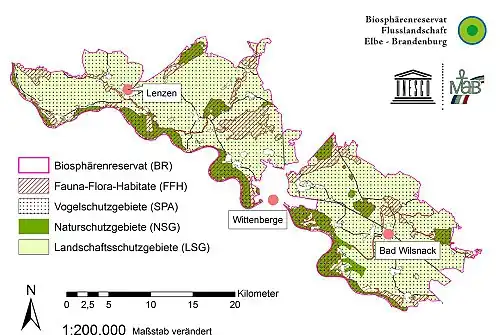 Das länderübergreifende UNESCO-Biosphärenreservat Flusslandschaft Elbe existiert seit 1997 durch die Anerkennung der UNESCO.[5] Es erstreckt sich über rund 400 Stromkilometer auf einer Fläche von 282.250,1 ha mit Teilgebieten in den Bundesländern Sachsen-Anhalt, Brandenburg, Niedersachsen, Mecklenburg-Vorpommern und Schleswig-Holstein. Es ist das größte binnenländische UNESCO-Biosphärenreservat in Deutschland.[6]