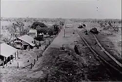 Schon bald zeigte sich, dass die Lage Birdums unglücklich gewählt war. Zum Verhängnis wurde der Siedlung ihre Position westlich des Birdum Creek. Sowohl der Stuart Highway als auch die Telegraphenleitung verliefen am Ostufer des Flusses. Dessen Querung mittels einer Furt stellte, vor allem während der Regenzeit, ein Problem dar, das als Provisorium tolerierbar war, mit dem drastisch erhöhten Verkehrsaufkommen sowie den gestiegenen Anforderungen an die Zuverlässigkeit aber nicht mehr tragbar war. Diese bot sich acht Kilometer nördlich von Birdum an: Hier berührte die Bahnstrecke nochmals Straße und Telegraphenleitung, bevor sie zwei Kilometer südlich mittels einer Brücke auf die Westseite des Flusses wechselte. An dieser wesentlich günstiger gelegenen Stelle entstand so zunächst eine militärische Ladestraße. Der neue Umschlagpunkt erhielt den Namen Larrimah, was in der mittlerweile ausgestorbenen Sprache des Ureinwohnervolkes der Yangman Treffpunkt bedeutet.[41] Auch für den neuen Militärflugplatz Gorrie, auf dem in seiner Hochphase 1943 6500 Menschen, darunter 440 Zivilangestellte, stationiert waren, lag Larrimah günstiger.[39] In der Folgezeit verlagerten sich die Funktionen als Warenumschlagplatz und lokales Geschäftszentrum sukzessive von Birdum nach Larrimah, ebenso die Wohnquartiere und die betriebstechnischen Einrichtungen der Eisenbahn. Larrimah wurde, so nicht offiziell, aber doch faktisch zum neuen Endpunkt der Nordaustralischen Eisenbahn.
