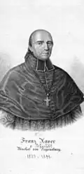 70 Franz Xaver von Schwäbl 1833 1841 Franz Xaver Schwäbl wurde als 21. Kind eines Bäckers im niederbayerischen Reisbach geboren. 1798 trat er in das Institut der Bartholomäer zu Ingolstadt ein. Dort und in Landshut studierte er und gehörte zu den Schülern von Johann Michael Sailer, der sein theologisches Denken und seine kirchliche Haltung entscheidend prägte. 1801 empfing Schwäbl in Regensburg die Priesterweihe. Zunächst in der Seelsorge tätig, lernte ihn Kronprinz Ludwig kennen und sorgte 1823 für seine Berufung als Kanonikus in das Münchner Metropolitankapitel. Erzbischof Lothar Anselm von Gebsattel betraute ihn mit der Aufsicht über die Priesterausbildung im Erzbistum München-Freising. Nach dem fast zeitgleichen Tod Bischof Sailers und Bischof Wittmanns ernannte ihn König Ludwig I. von Bayern 1833 zum neuen Bischof von Regensburg. Franz Xaver Schwäbl bemühte sich um die Erneuerung der Seelsorge im Sinne von Bischof Sailer, besonders lag ihm die Priesterausbildung am Herzen. Er führte einen eigenen Katechismus ein und belebte das Kloster- und Ordenslebens in seinem Bistum. In seine Amtszeit fällt auch die Regotisierung des Domes in Regensburg (1835–1839).