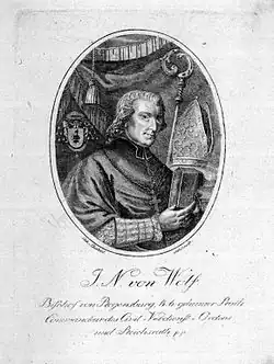 66 Joseph Konrad Freiherr von Schroffenberg 1790 1803 Joseph Konrad war zunächst Fürstpropst von Berchtesgaden (1780–1803) und nahm die Bischofswürde in Regensburg und Freising (1789–1802/1803) an. In der Folge der Säkularisation verlor Joseph Konrad seine Ländereien. Im Reichsdeputationshauptschluss wurde das Hochstift Regensburg in das Fürstentum Regensburg umgebildet.
