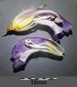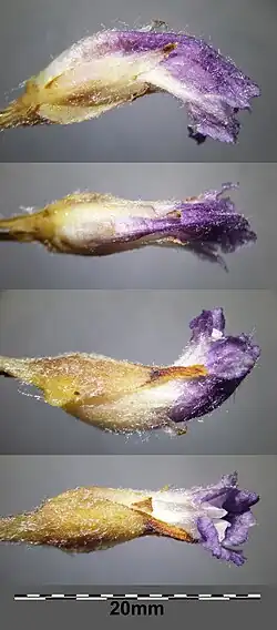 Die Blütenstände sind bis zu 10 (selten bis zu 18) cm hoch und 2,5 bis 3,5 cm breit, meist dicht gebaut und spinnennetzartig wollig behaart. Die Tragblätter sind etwa so lang wie die Krone und lanzettlich-zugespitzt. Der Kelch ist 8 bis 13 mm lang, die Kelchblätter stehen frei und sind mehr oder weniger zweigezahnt. Die Krone ist (selten nur 10 bis) 14 bis 23 mm lang, spinnennetzartig wollig behaart, blass violett-blau gefärbt, nahezu aufrecht und an der Basis etwas aufgeblasen. In der Mitte ist sie eingeschnürt, der äußere Teil ist abstehend. Die Lappen der Unterlippe sind nahezu gleich und nicht bewimpert. Die Staubfäden sind unbehaart und setzen etwa 6 bis 7 mm oberhalb der Kronenbasis an. Die Staubbeutel sind meist unbehaart. Die Narbe ist blass-gelb.