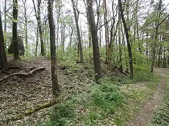 Die Blücherschanze – am rechten Bildrand der Lahnhöhenweg, am linken Bildrand das Denkmal | |