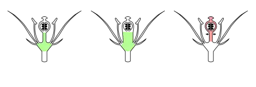 rot Fruchtknoten; I oberständig (hypogyne Blüte), II halbunterständig (epihypogyne oder perigyne Blüte), III unterständig (epigyne Blüte) (gynoeceales Hypanthium)