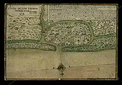 1764 erstellte der spanische Oberst Luis Diéz de Navarro (1699–1780), einer der bekanntesten Kartographen seiner Zeit, eine Karte von Black River.[27] Die Karte "Costa, y poblaciones que ay en Rio Tinto" zeigt nicht nur die Lage von englischen Siedlungen entlang des Flusses, sondern beschreibt auch deren Einwohner, Engländer, Neger, Indios und Mestizen, gemeines Volk, Mulatten, fischende, ackerbautreibende und Schildkröten jagende Mestizen, Negersklaven und Zambos.[28] Diéz betrachtete die Rassenmischung der Siedlung als Beleg für die generelle Lasterhaftigkeit der Engländer[29]. Auf der Karte ist auch eine sternförmige Befestigung auf der vorgelagerten Sandbank zu sehen.