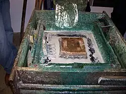 Der Papp muss eingetrocknet sein, bevor die Stoffe gefärbt werden können. Dazu wird der Stoff auf ein Trockenreck gespannt. Papp wird unter anderem aus Gummi arabicum, weißer Tabakspfeifenerde, Kupfersulfat, Kupferacetat und anderen chemischen Substanzen hergestellt;[5] die genauen Rezepturen werden gut gehütet und sind zum Teil seit Jahrhunderten überliefert. Nach dem Färben wird der Papp mit verdünnter Schwefelsäure entfernt.